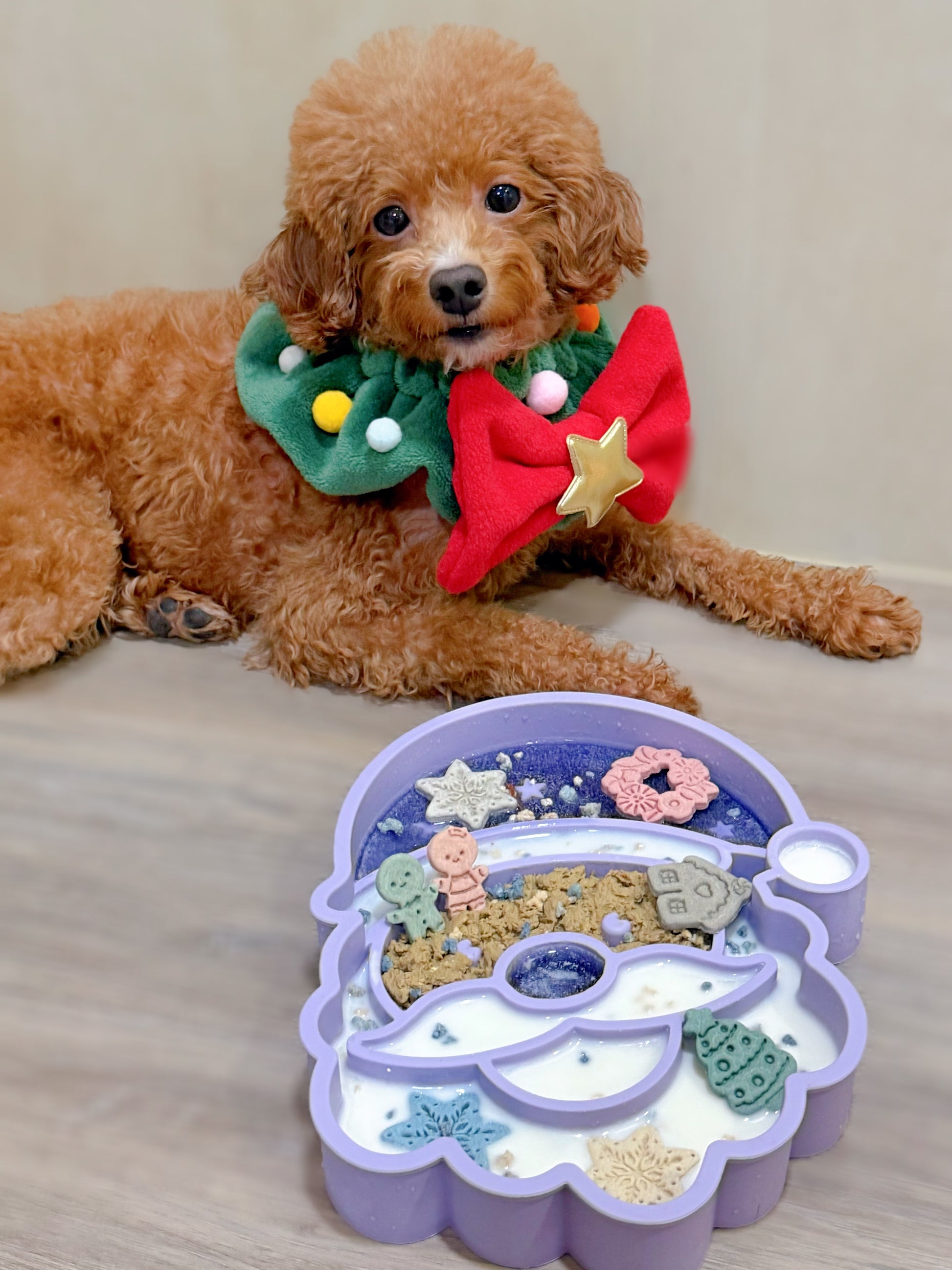 a seasonal slow feeder - the came to sleigh feeder. a slow feeder aids in slowing down eating thus aiding in digestion and reduces bloating, gas and vomiting. with the different textures, holes and sizes, it adds mental stimulation, helping your pet to better regulate their emotions, reducing anxiety, stress & boredom