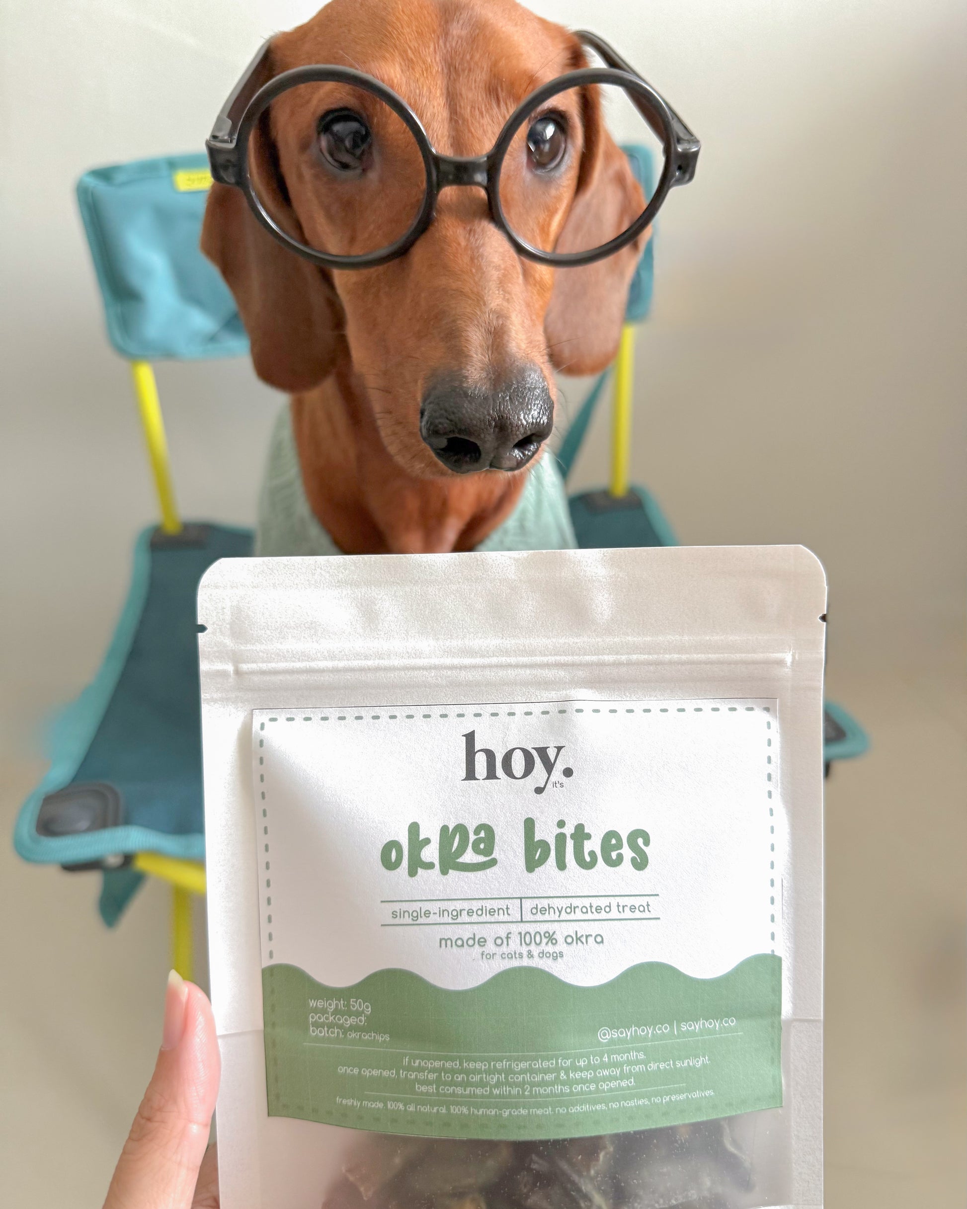 our okra bites treats are made from 100% okra. each baggy contains 50g of dehydrated okra