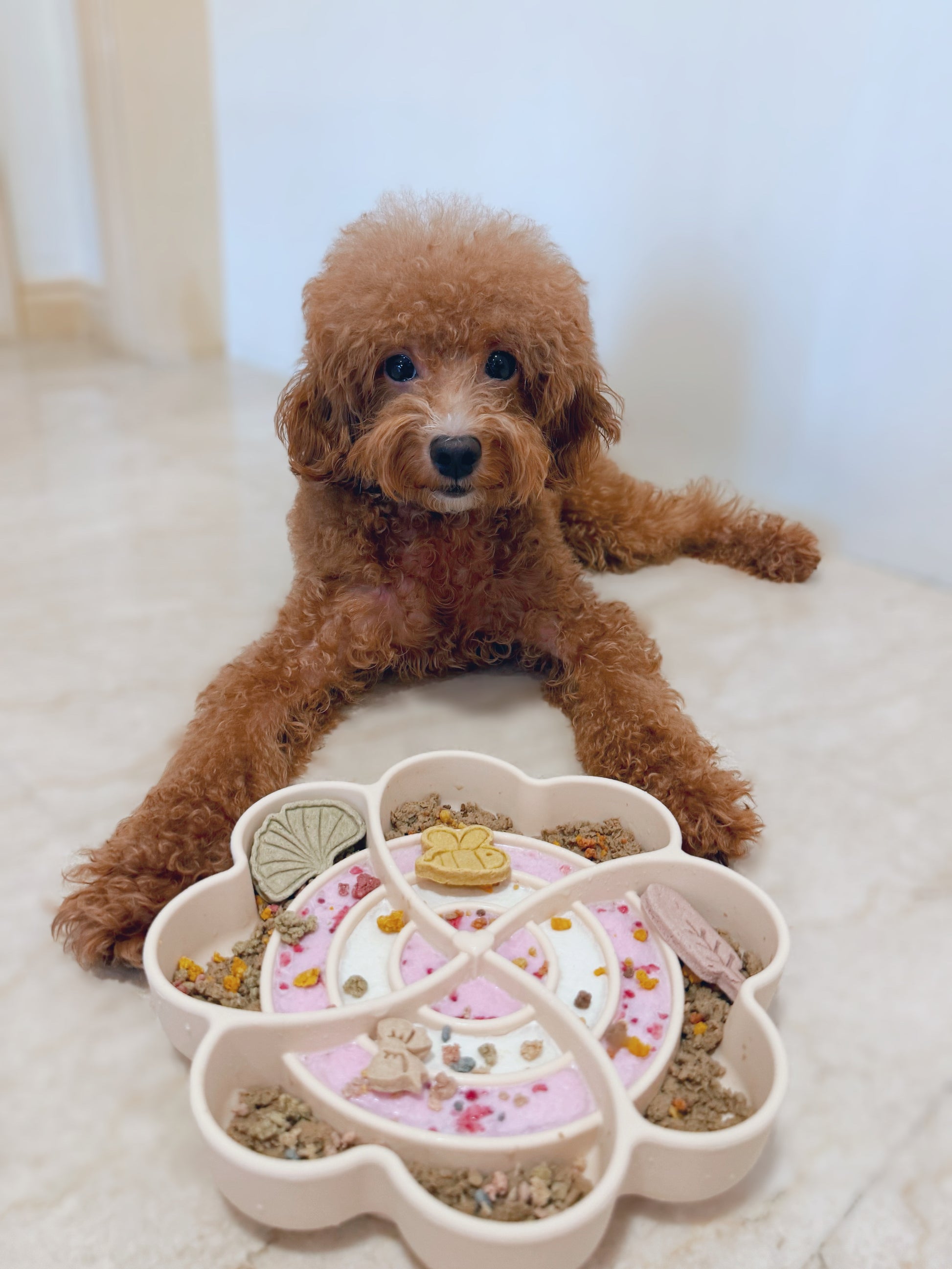 the brownie slow feeder. a slow feeder aids in slowing down eating thus aiding in digestion and reduces bloating, gas and vomiting. with the different textures, holes and sizes, it adds mental stimulation, helping your pet to better regulate their emotions, reducing anxiety, stress & boredom