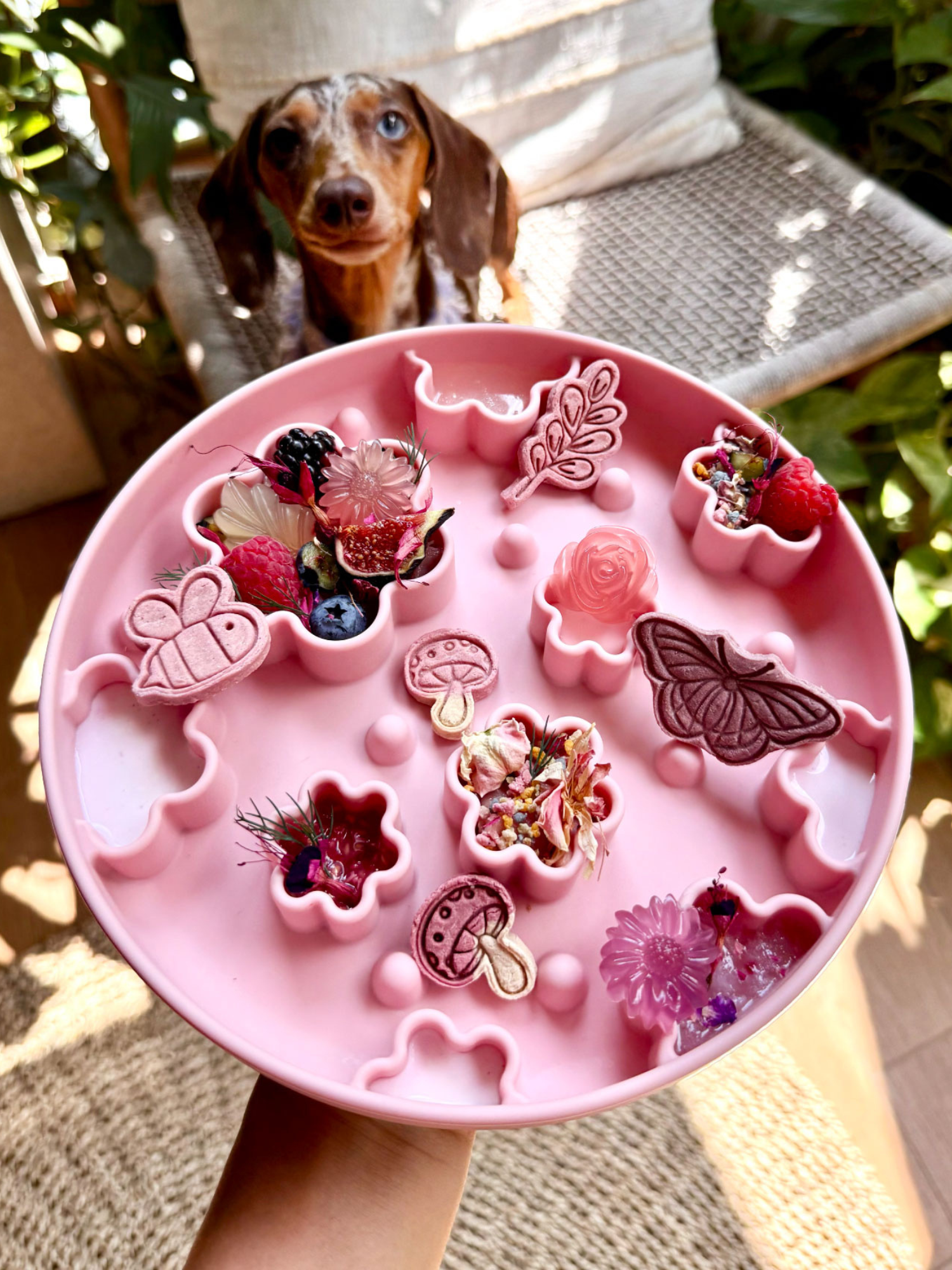 - freeze colored broth/yoghurt for extra licking