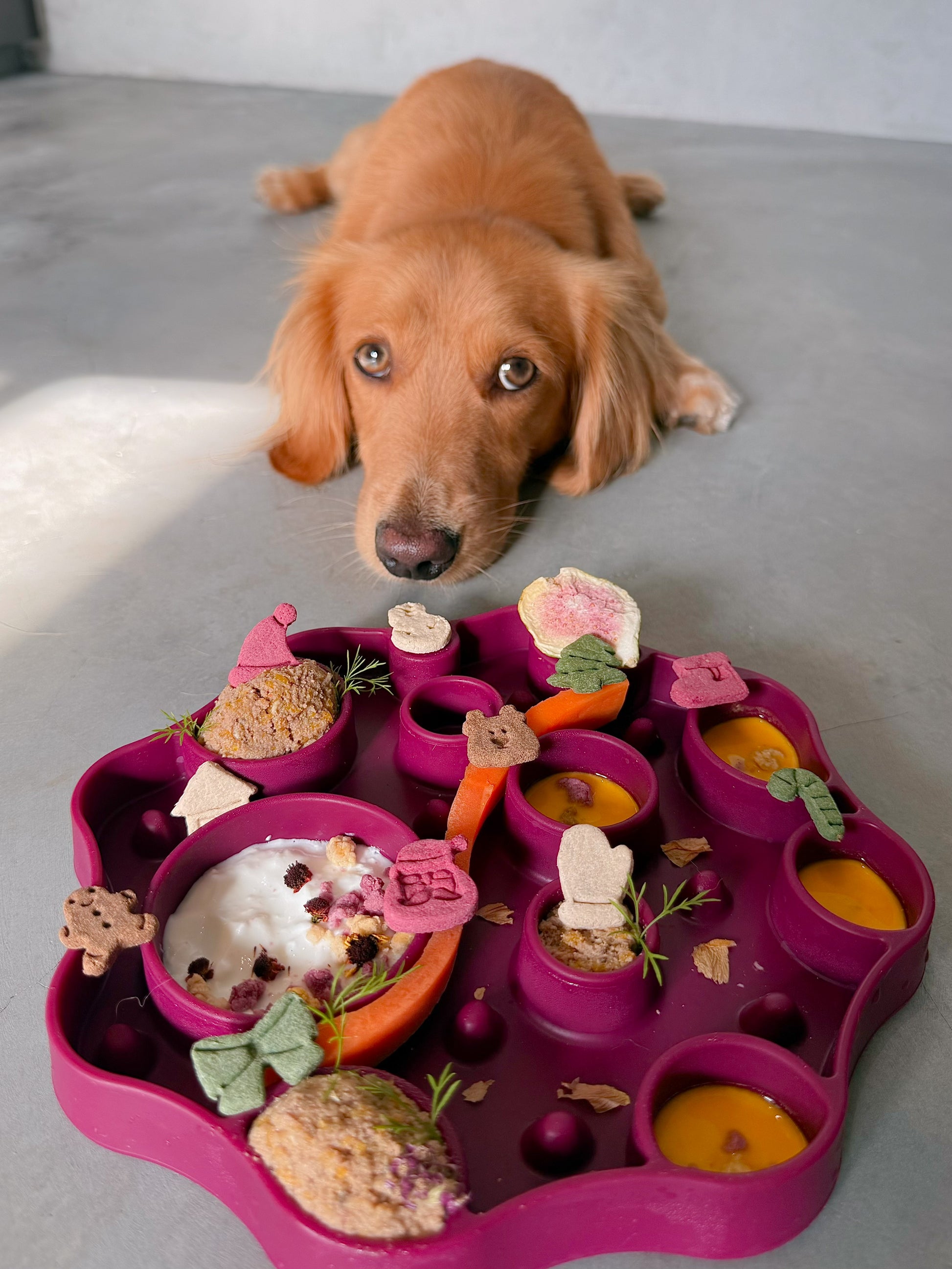 - freeze colored broth/yoghurt for extra licking